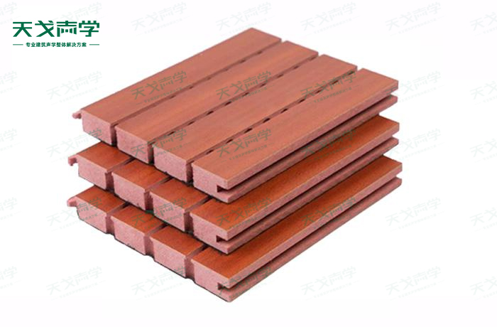 天戈木質(zhì)阻燃吸音板是一種在密度板的正面開槽、背面穿孔的狹縫共振吸音材料。槽木吸音板對吸聲頻譜選擇性很強,對中低頻有很好的吸聲性能。若在吸聲結(jié)構(gòu)后空腔填入適量的吸聲棉可提高中、高頻吸聲效果,標準化模塊設(shè)計,采用插槽、龍骨結(jié)構(gòu),安裝簡易,常用于墻面或天花裝飾。