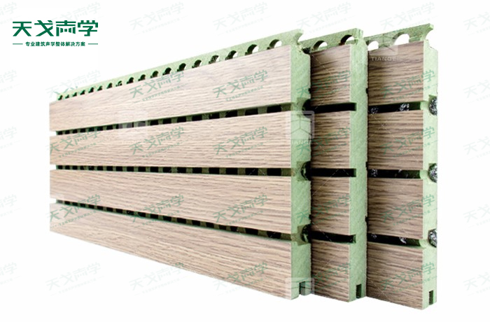 天戈防潮槽木吸音板是一種在密度板的正面開槽、背面穿孔的狹縫共振吸音材料。防潮槽木吸音板對吸聲頻譜選擇性很強,對中低頻有很好的吸聲性能。若在吸聲結(jié)構(gòu)后空腔填入適量的吸聲棉可提高中、高頻吸聲效果,標準化模塊設(shè)計,采用插槽、龍骨結(jié)構(gòu),安裝簡易,常用于墻面或天花裝飾。