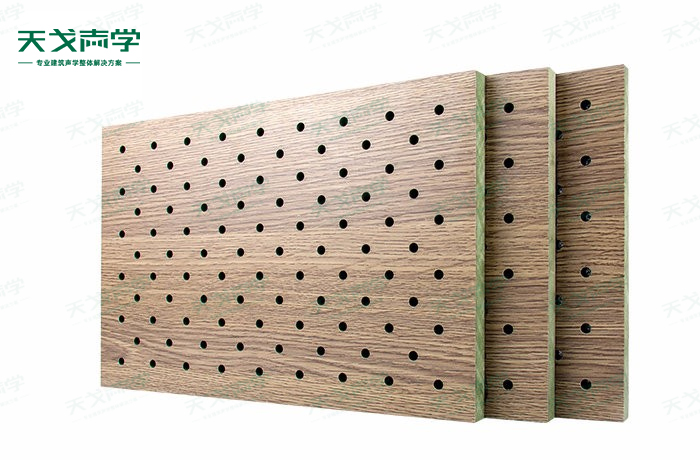 天戈體育館孔木吸音板飾面顏色及材料選擇性廣,孔徑、孔距可根據(jù)客戶要求調(diào)整,能很好地滿足客戶多樣化的聲學(xué)及裝飾需求。孔木吸音板對(duì)吸聲頻譜選擇性較強(qiáng),對(duì)中低頻有很好的吸聲性能。如在吸聲結(jié)構(gòu)后空腔上填入適量的吸聲棉可提高中、高頻吸聲效果。