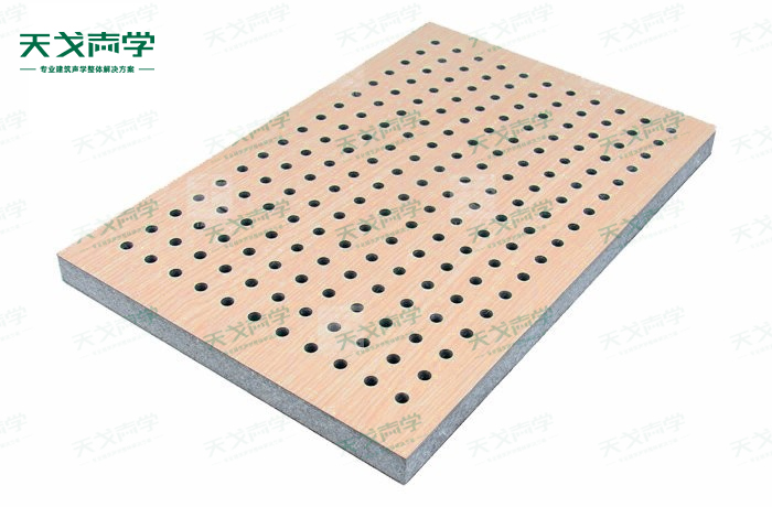 天戈玻鎂防火吸音板飾面顏色及材料選擇性廣,孔徑、孔距可根據(jù)客戶要求調(diào)整,能很好地滿足客戶多樣化的聲學(xué)及裝飾需求。孔木吸音板對(duì)吸聲頻譜選擇性較強(qiáng),對(duì)中低頻有很好的吸聲性能。如在吸聲結(jié)構(gòu)后空腔上填入適量的吸聲棉可提高中、高頻吸聲效果。