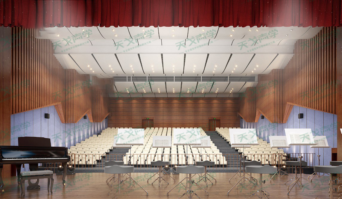 禮堂的聲學(xué)設(shè)計(jì)方案吻合裝飾需求,木條吸聲造型和穿孔木質(zhì)吸音板在展現(xiàn)強(qiáng)烈的木質(zhì)肌理裝飾性,為了起到很好的吸聲效果,墻面底部還裝有砂巖吸音板,對(duì)于降低室內(nèi)混響起著重要作用。