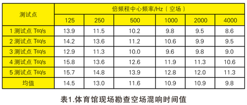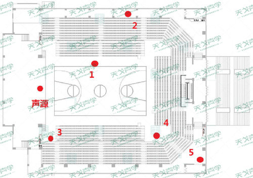 因該館業(yè)主前期不了解聲學(xué)的重要性,導(dǎo)致在建設(shè)過程中沒有考慮建筑聲學(xué)設(shè)計,竣工后體育館內(nèi)聽音模糊,聲學(xué)缺陷嚴(yán)重,回聲很大,難以滿足體育館的功能需求;在設(shè)計前設(shè)計師對現(xiàn)場進行了聲學(xué)測試,測試結(jié)果如下: