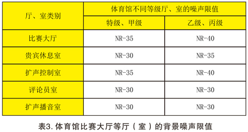 建筑聲學(xué)設(shè)計的目標(biāo)是使體育館在使用過程中聲音清晰、音質(zhì)優(yōu)美。根據(jù)《體育館建筑設(shè)計規(guī)范》(JGJ31-2003;J265-2003),體育館滿場中頻(500Hz)混響時間宜在1.5-1.7s,根據(jù)體育館內(nèi)容納人數(shù)折算后,空場中頻(500Hz)混響時間宜在2.0s左右,低頻混響時間允許稍長,高頻混響時間允許稍短。其空場混響時間頻率特性見表2.根據(jù)體育館設(shè)計規(guī)程,體育館比賽大廳等房間的室內(nèi)背景噪聲限制參考見表3.
