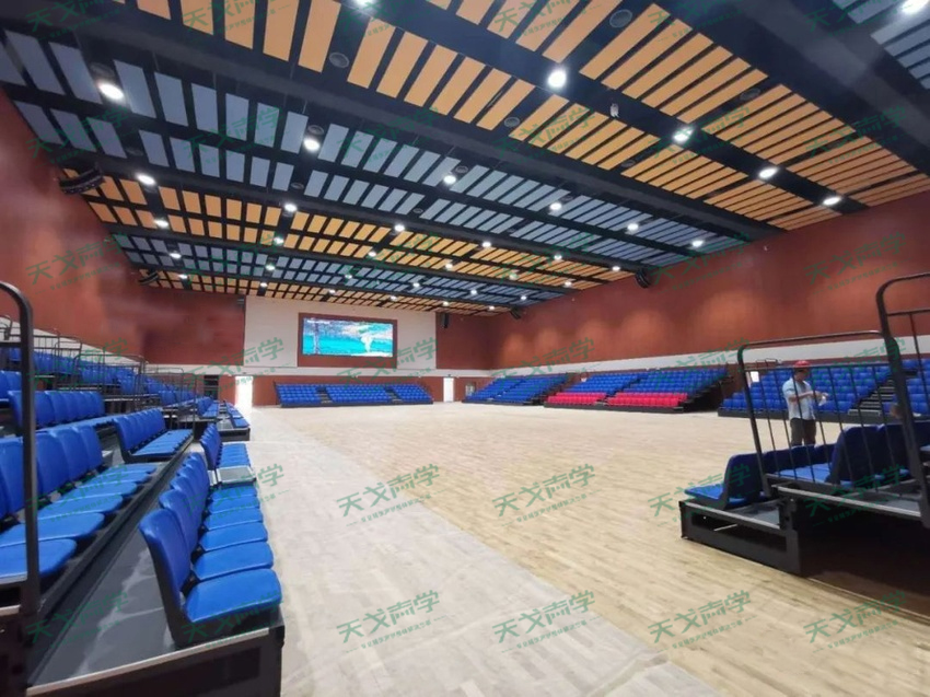 廣州增城經(jīng)濟(jì)開發(fā)區(qū)體育館雖然是一個(gè)小型體育館,但也由于容積較大,致使比賽大廳混響時(shí)間過(guò)長(zhǎng)。過(guò)長(zhǎng)的混響時(shí)間會(huì)降低比賽大廳的音質(zhì)清晰度,使觀眾的聽音混濁,影響比賽的效果和口碑。對(duì)于運(yùn)動(dòng)員則可能由于館中音質(zhì)問(wèn)題而大失水平。